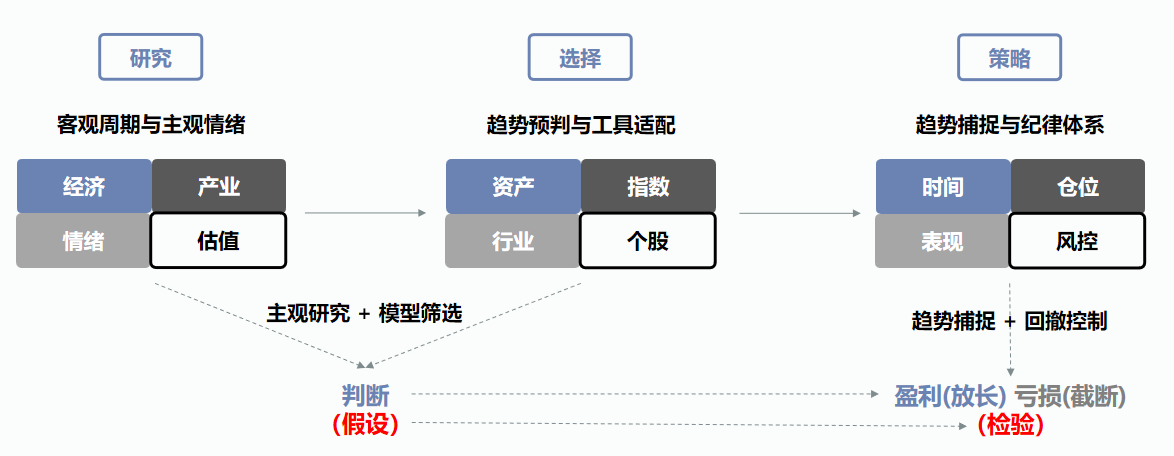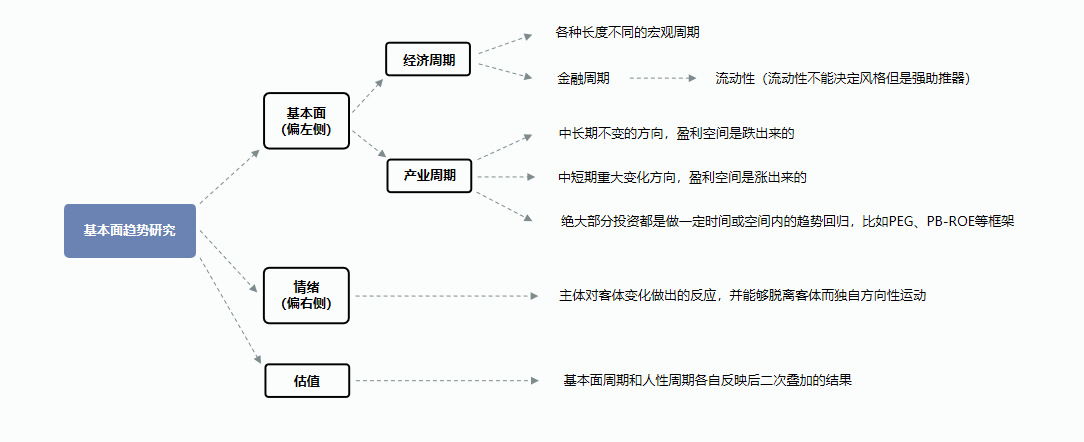 在基本面研究阶段,即以趋势产生为研究导向,综合经济周期与产业周期位置,选择未来1~3年基本面周期向上的资产、行业以及优质个股(ROE变化为核心),同时根据估值反映的情绪溢价/折价,做出相应的空间测算