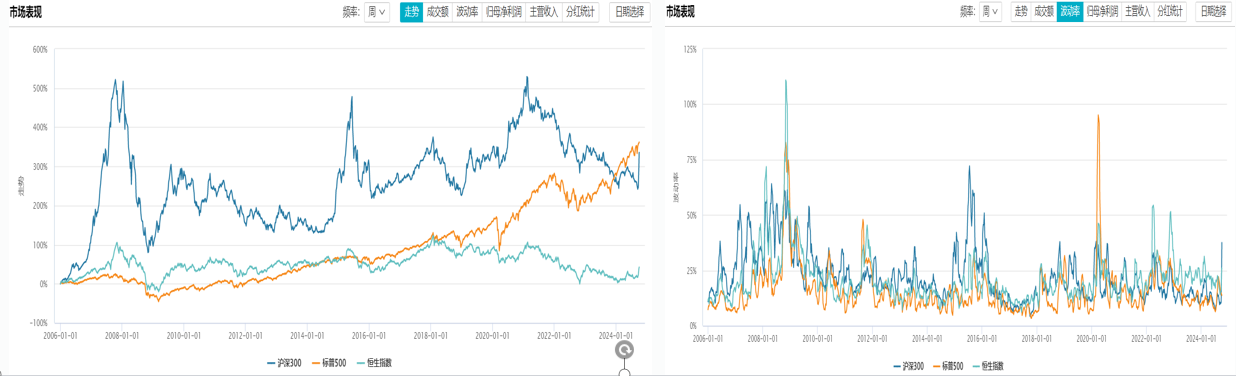 以权益资产为例,选取分别代表中美经济三个主要指数,沪深300、标普500和恒生指数。观察三大指数自2006年1至2024年9月末的涨幅及过程,初步得到两个直观发现: